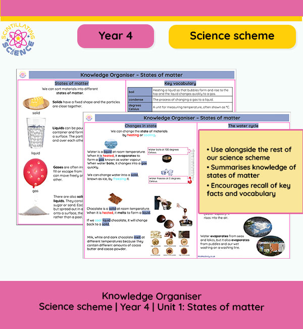 Our Year 4 States of Matter unit introduces pupils to solids, liquids and gases through hands-on investigations, real-life contexts and enquiry-based science. Children explore how materials behave when heated or cooled, how chocolate melts, and how water changes state during the water cycle.